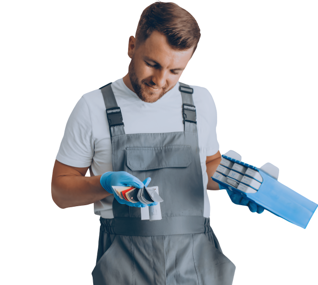 Наши лаборатории цветоподбора оснащены современным оборудованием, включая профессиональные окрасочные пистолеты, лампы колориста и спектрофотометр.